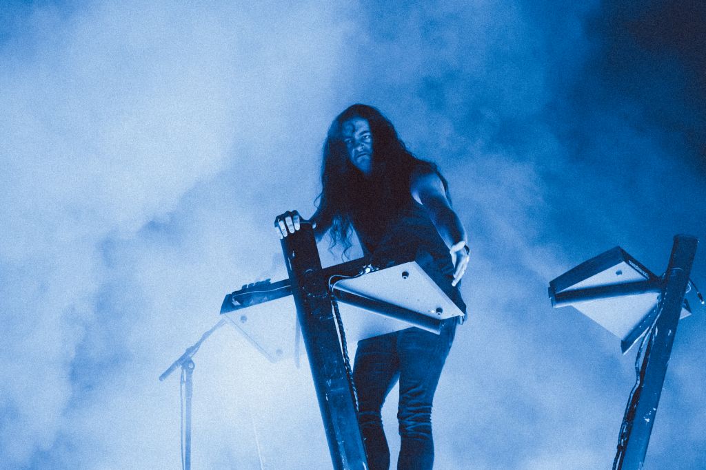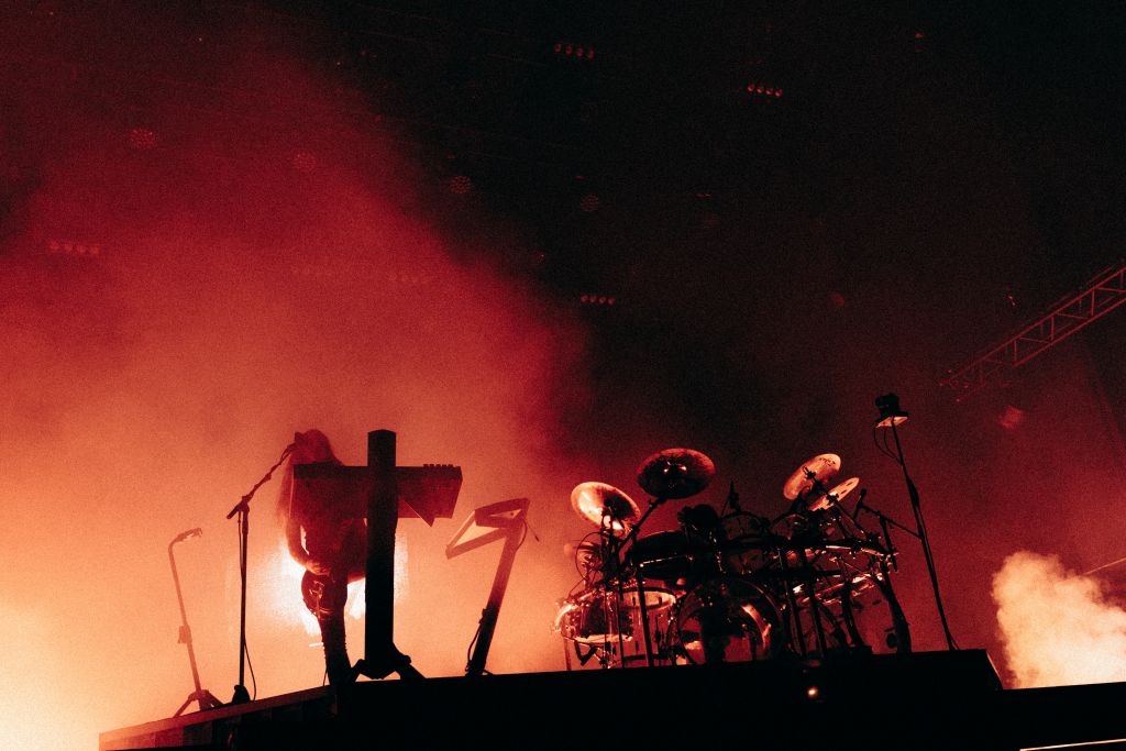 Après l’explosion de couleurs et de costumes des formations précédentes, la nuit noire tombe enfin sur le Plane’R Fest et cède la place à une toute autre atmosphère. Le public se masse devant la grande scène, déjà hypnotisé par la lumière rouge sang et les nappes de fumée épaisse. Il y a certes moins de monde devant la scène, mais Perturbator entre en scène sous un tonnerre d’applaudissements, porté par un visuel absolument saisissant.