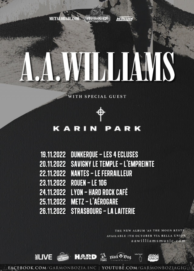 Notre partenaire Garmonbozia présente cette très belle tournée française aux tonalités mélancoliques pour A.A. Williams, qui sera accompagnée de la Suédoise Karin Park (dark pop) :