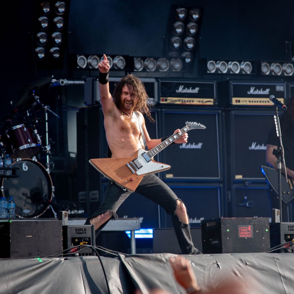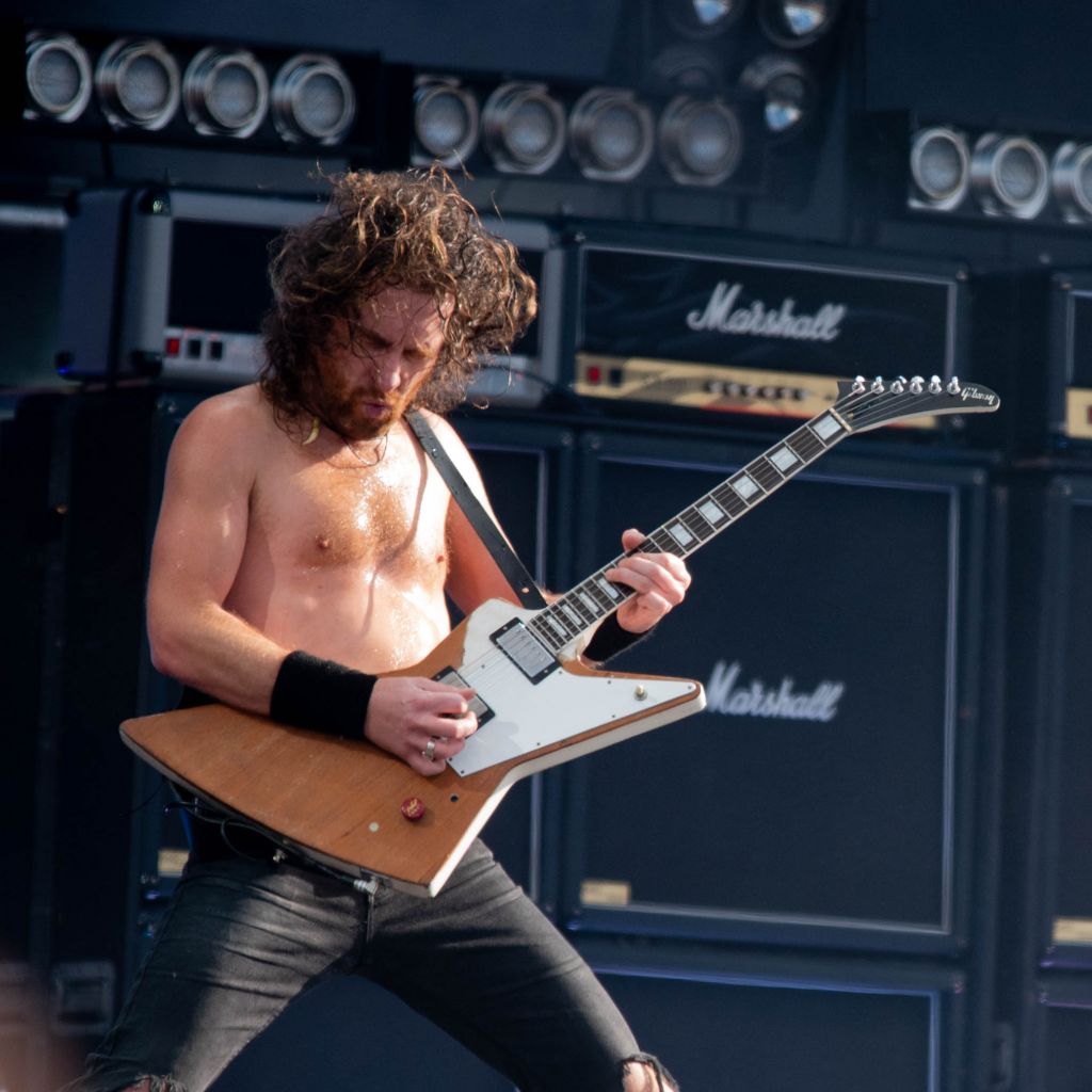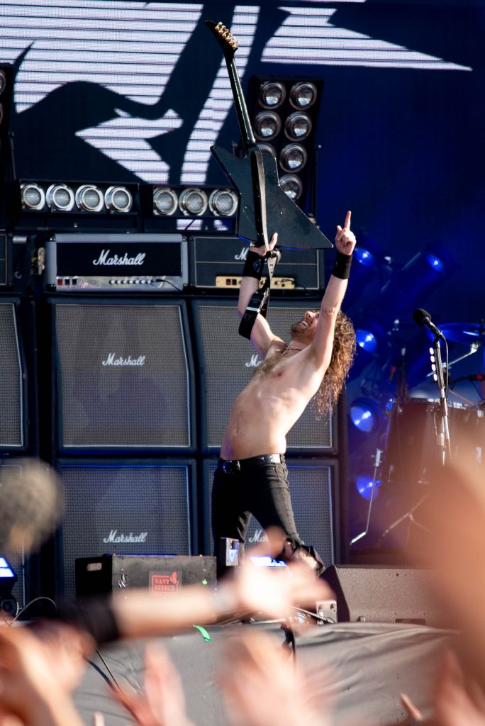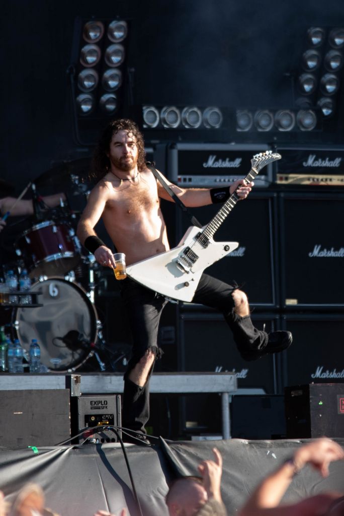 Niveau setlist, le groupe puise de manière assez équilibrée dans toute sa discographie, et les récents "Boneshaker", "Burnout The Nitro", "Breakin Outta Hell" sont représentés autant que les titres plus anciens "Bottom Of The Well", "Raise The Flag" sans oublier le classique "Girls In Black". Évidemment, on préfèrerait une setlist qui mette un peu plus en avant les deux premiers opus, plus riches en titres bien énergiques, mais reconnaissons que la setlist est bien équilibrée, surtout qu'il y a sur presque tous les titres des départs en solo. Nous sommes en festival et Airbourne est loin d’être le seul groupe à ne reprendre globalement que des tubes. Joel titille les festivaliers en leur disant qu’ils sont, pour la majorité, complètement fous d’enchainer deux week-ends de festival, mais qu’il va falloir tout donner pour le live des Australiens.