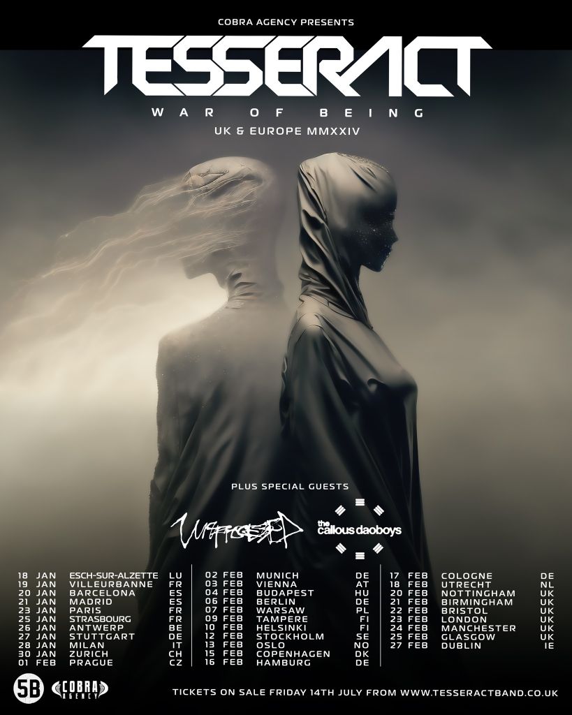 Formé en 2007 et portée par la voix envoûtante de Daniel Tompkins, la musique de TesseracT est une véritable performance technique. Le groupe forge sa réputation au travers de ses deux premiers albums One (2011) et Altered State (2013). Avec un univers et des textes énigmatiques, le groupe bâtit une carrière solide autour d’un metal progressif à la fois massif et atmosphérique, applaudi autant par la presse que par le public. Tesseract sort son troisième album Polaris en 2015 chez Kscope, suivi en 2018 par Sonder. Le combo n’a de cesse de se démarquer de la concurrence, tout en forgeant un univers musical et lyrique qui n'appartient qu'à lui. Le quintette s’impose également comme un groupe live d'une grande puissance, avec d'innombrables shows acclamés et des apparitions dans des festivals à travers le monde entier. Après l’impressionnant album live Portals sorti en 2021, il est temps pour TesseracT d’entamer un nouveau chapitre de son histoire. Le groupe dévoile en juillet 2023 le premier extrait de son cinquième album à venir, War Of Being ainsi qu'une tournée européenne passant à Lyon, Strasbourg et Paris en janvier 2024.