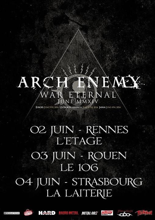 On s'en rappelle, Arch Enemy avait du annuler son passage au Hellfest l'année dernière. Et bien afin de rassurer ses fans français, le groupe prévoit trois dates en province pour le mois de Juin prochain, quelques jours avant la sortie de leur nouvel album War Eternal prévu pour le 9 Juin.