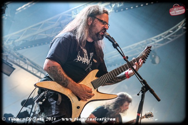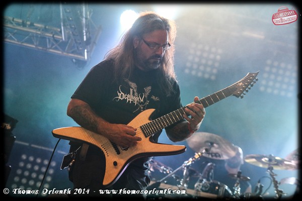 Le public en pleine introspection ne bouge pas, mais les applaudissements nourris en fin de morceaux indiquent qu’il est totalement sous le charme des riffs noirs et complexes de la musique de Gorguts. Cela sera le cas sur l’ensemble du début du set, consacré pleinement à Colored Sands. Gorguts envoute, Gorguts hypnotise, par le biais des harmoniques de Kevin Hufnagel qui ont pour but d’enrichir la musique par de petites touches ambiantes. Totalement concentrés sur leur art, qu’ils maîtrisent à la perfection, les Canadiens ne communiquent que peu avec le public, mais lors des interludes, Luc Lemay remercie chaleureusement et en français ses « cousins d’outre Atlantique ».