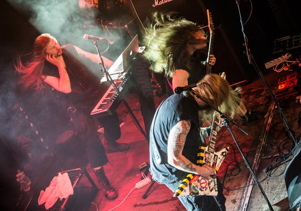 L’accès enfin possible, la salle est déjà presque pleine. Les Finlandais bougent dans tous les sens sur la scène du Divan du Monde avec une énergie communicative. On le sent bien, ils prennent leur pied à jouer et le public le lui rend bien car aussi sautillant et headbangant qu’eux, les longues chevelures tournoient à grande vitesse ! Nous avons en fasse de nous de très bon musiciens, techniques et inventifs qui interagissent avec le public, ils demandent des circle pits : ils sont exaucés.