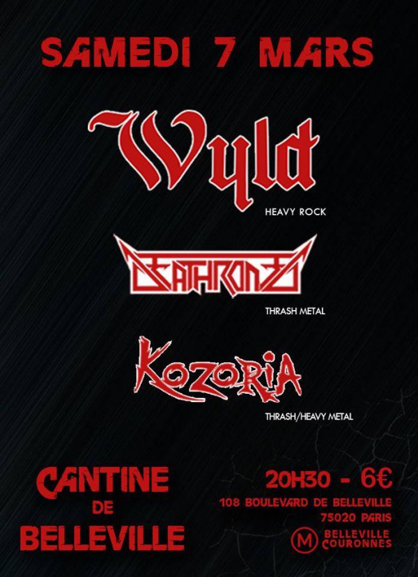 Le samedi 7 mars à La Cantine de Belleville (Paris, 20ème) une belle soirée heavy thrash en compagnie de WYLD + DEATHRONED + KOZORIA.
