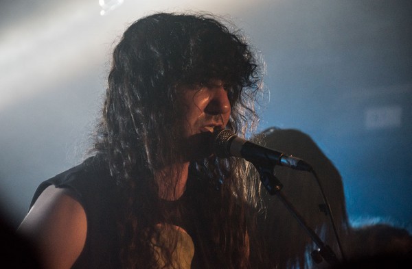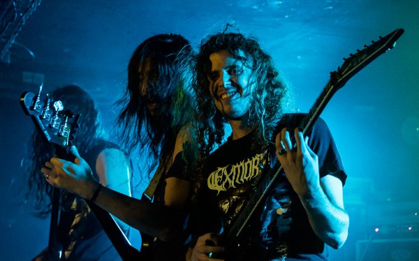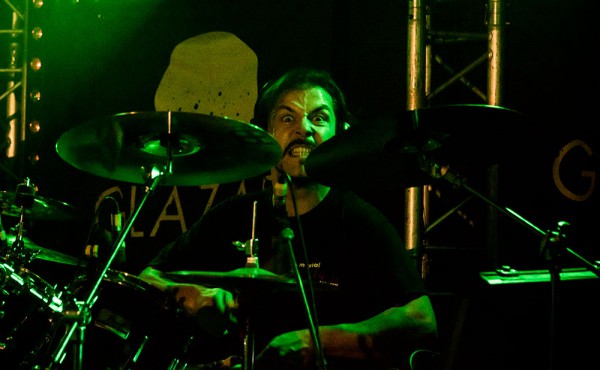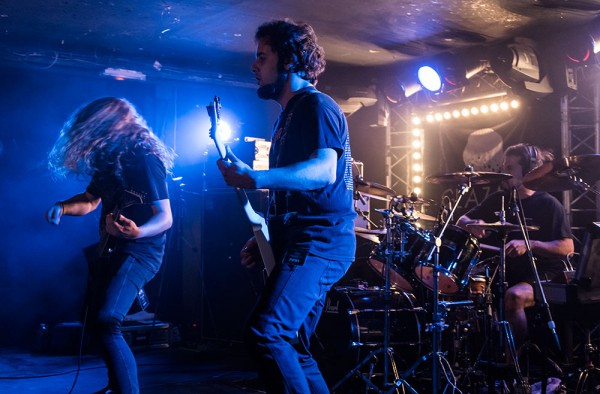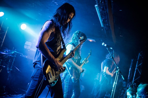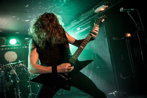 Après une fouille minutieuse à l’entrée de la salle, le public peut admirer un jeune trio, jusqu’alors inconnu au bataillon. Et pour cause, Distillator s’est formé en 2013 et vient tout juste de sortir son premier album, Revolutionary Cells. Dès le début de « Suicidal », le premier titre, on sent l’envie des jeunes musiciens de faire renaître l’esprit du thrash des années 80. S’inscrivant dans la même veine qu’Havok, le trio brille également par son jeu de scène et la qualité des compositions, qui bien qu’assez classiques font preuve d’une redoutable efficacité en live. Certes la musique du trio n’est pas des plus complexes à interpréter, mais elle fait mouche et c’est bien là le principal. Laurens (chant, guitare) possède un timbre de voix proche de celui d’un Steve Souza (Exodus) et balance des soli rappelant ceux de Kerry King à ses débuts. Le public suit totalement les injonctions du leader et headbangue en rythme, tandis que Frankie Suim (basse) court partout sur la pourtant très petite scène du Glaz’art. On sent les musiciens totalement dans leur élément, comme s’ils avaient dix ans d’expérience derrière eux, preuve que de jeunes formations en veulent et se donnent les moyens de parvenir à leurs fins.