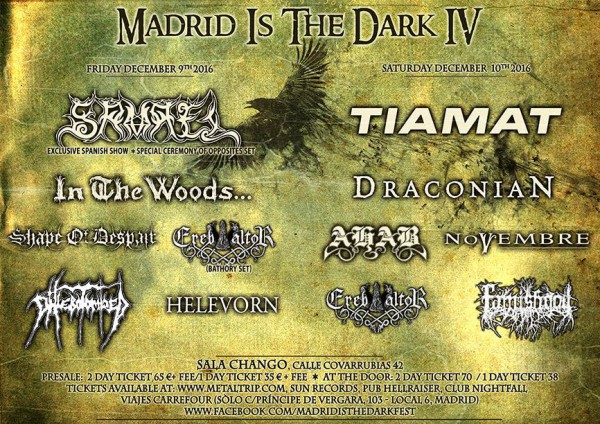 La capitale espagnole accueille pour sa quatrième édition le festival Madrid is the Dark qui se déroulera le 9 et 10 décembre prochain dans l’écrin du Sala Changó Live. L’affiche de cette année est particulièrement relevée en combos rares tels que les Italiens de Novembre, les Néerlandais de Phlebotomized ou les mythiques Norvégiens d’In the Woods.