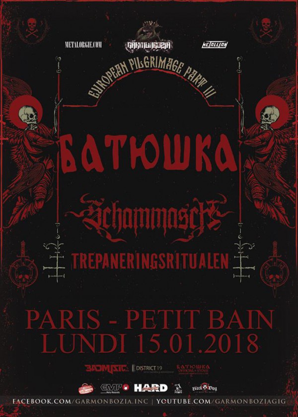 Mi-janvier 2018 verra le retour pour un concert unique en France des Polonais de Batushka et leur black metal peu orthodoxe. Pour les précéder sur la scène du Petit Bain, l'affiche est également constituée des Suisses de Schammasch et des Suédois de Trepaneringsritualen.