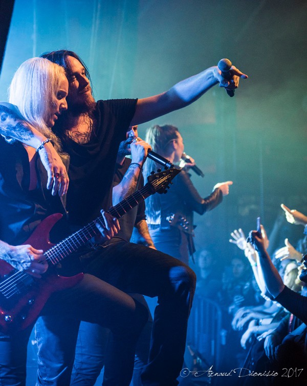 Changement d’ambiance avec Amaranthe. Les Suédois sont attendus par une bonne partie de la salle, désormais quasiment comble, et leur death mélodique mêlé de pop (à moins que ce ne soit l’inverse ?) fait mouche dans l’assemblée dès le premier morceau, "Maximize", issu de leur dernier album Maximalism, tout comme les deux suivants. Sur le papier, l’idée peut séduire : mêler un metal puissant à base de growl et de guitares techniques à un chant très pop et des claviers lorgnant sans vergogne vers l’electro. En pratique, le résultat est assez artificiel. On dirait que les Suédois juxtaposent deux styles contradictoires sans vraiment réussir à les fusionner.