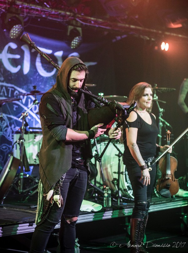 Les lumières s’éteignent, une voix caverneuse retentit pour déclamer le prologue, et dans l’obscurité bleutée, neuf silhouettes prennent place l’une après l’autre. L’ennéade helvète (oui, ils sont actuellement neuf, on espère qu’ils ont un grand tourbus) lance "The Gaulish War", issu de leur tout premier album Spirit. Que les fans inquiets par la tournure folk du dernier album se rassurent, il n’est donc pas question de renier les origines. Le côté death mélodique du morceau met tout de suite les cris du leader Chrigel Glanzmann et les riffs des guitaristes Rafael Salzmann et Jonas Wolf en avant. Les instruments acoustiques, en revanche, s’entendent assez peu selon l’emplacement dans la salle, mais on peut assister à un magnifique headbang coordonné tout en longs cheveux du trio féminin du groupe.