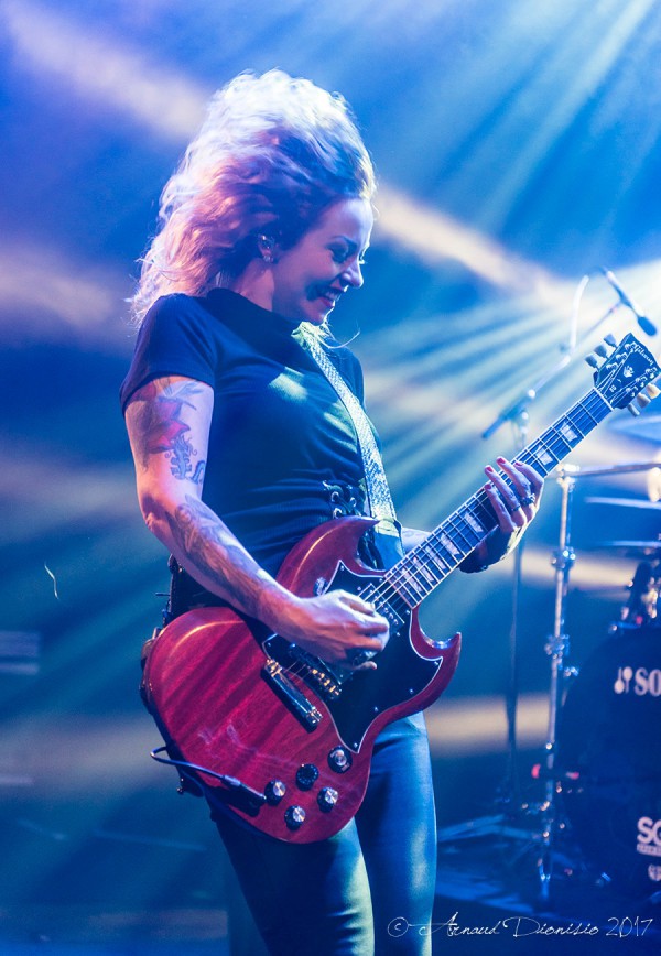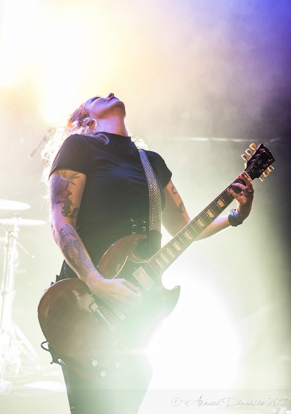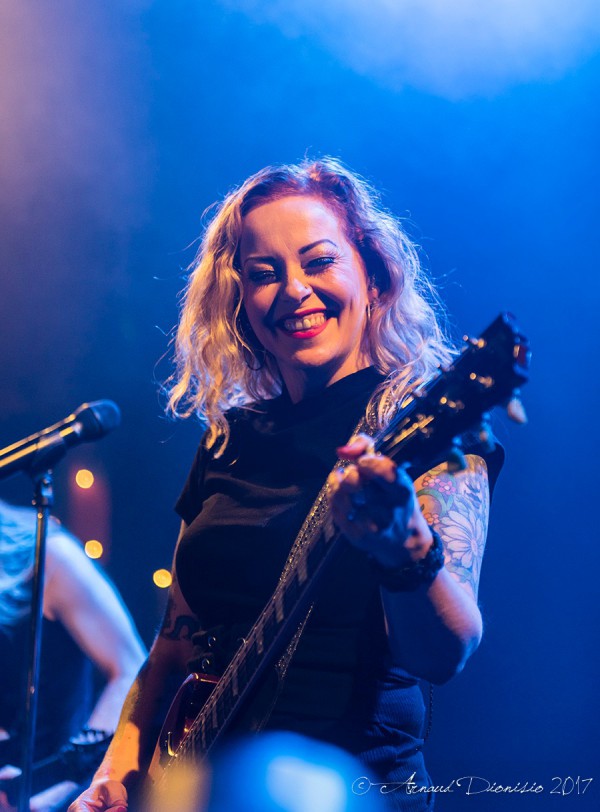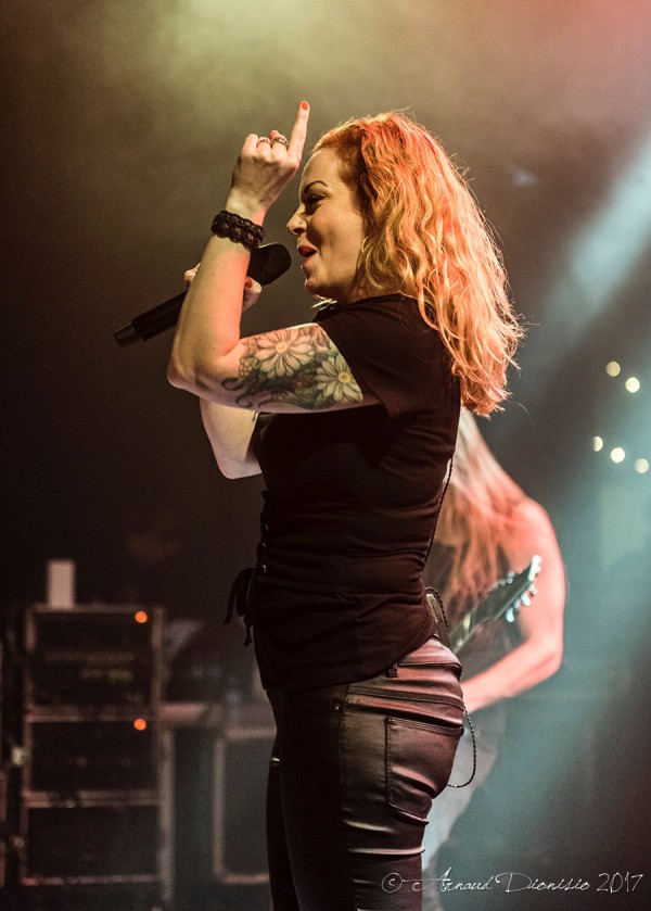 Pour une tête d’affiche et un premier concert, c’est le néant niveau décorum et jeu de lumière, ce dernier étant peu travaillé sans doute pour plus de simplicité et pour permettre de se concentrer sur la musique. Et il faut bien le dire niveau prestation vis-à-vis des précédentes dates, celle de ce retour heavy de la Néerlandaise est très positif. L’entrain et la joie de chanter inaltérable d’Anneke avec ou sans sa SG, sont toujours aussi communicatifs.