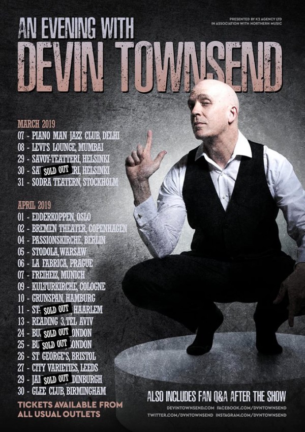Devin Townsend vient d'annoncer une tournée acoustique européenne très spéciale qui commencera fin mars 2019 et se poursuivra tout le mois d'avril. En effet, le principe de "An Evening With" c'est de proposer des concerts intimes avec une session de questions / réponses entre le public et l'artiste à la fin de la soirée. Devin Townsend jouera bien entendu des morceaux de son catalogue et compte bien partager avec ses fans des informations sur son prochain album "Empath".