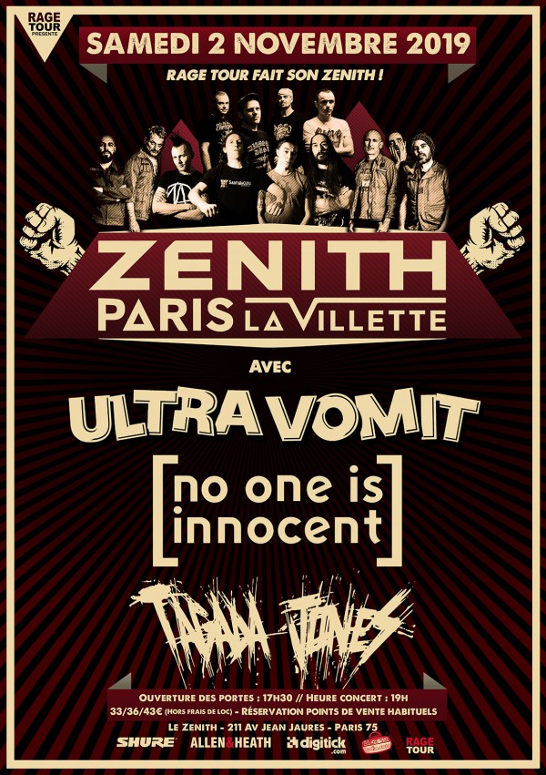 Rage Tour fait son Zénith le samedi 2 novembre 2019 à Paris ! Que du beau monde pour cette affiche de gala : Ultra Vomit, No One Is Innocent et Tagada Jones.