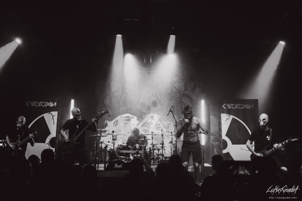 18H30, les lumières s’éteignent, les choses sérieuses peuvent maintenant commencer. Connu et reconnu pour son univers et son jeu de scène tout particulier sur fond délirant radioactif tchernobilien, Cytotoxin ne va pas nous faire mentir la-dessus et est le premier à fouler la scène. Après que Jason nous exhibe un masque à gaz, véritable symbole du combo, Grimo fait son entrée à son tour, portant un masque à cartouche sur le visage, se plaçant en plein centre de la scène, un fût radiactif entre les mains. Les néons positionnés de part et d'autre de Stocki finissent de nous plonger dans le délire des Allemands. Le frontman enlève son masque et c'est un magistral pig squeal, le premier d'une longue série de ces cris caractéristiques du metal extrême semblable à des hurlements de cochon, qui ouvre les hostilités sur « Sector Zero » et l'incontournable « Radiophobia ».
