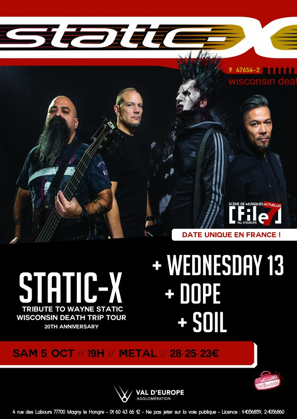 Cinq ans après le décès tragique de son leader, Wayne Static, Static-X revient sur scène pour une tournée hommage, en revisitant son premier méfait "Wisconsin Death Trip". Les américains passeront dans l'hexagone pour leur unique date française au File 7 à Magny-le-Hongre (77) le samedi 5 octobre 2019 La dernière fois que le groupe a joué en France c'était il y a presque 15 ans à Bercy le 14 juin 2004 avec Korn.