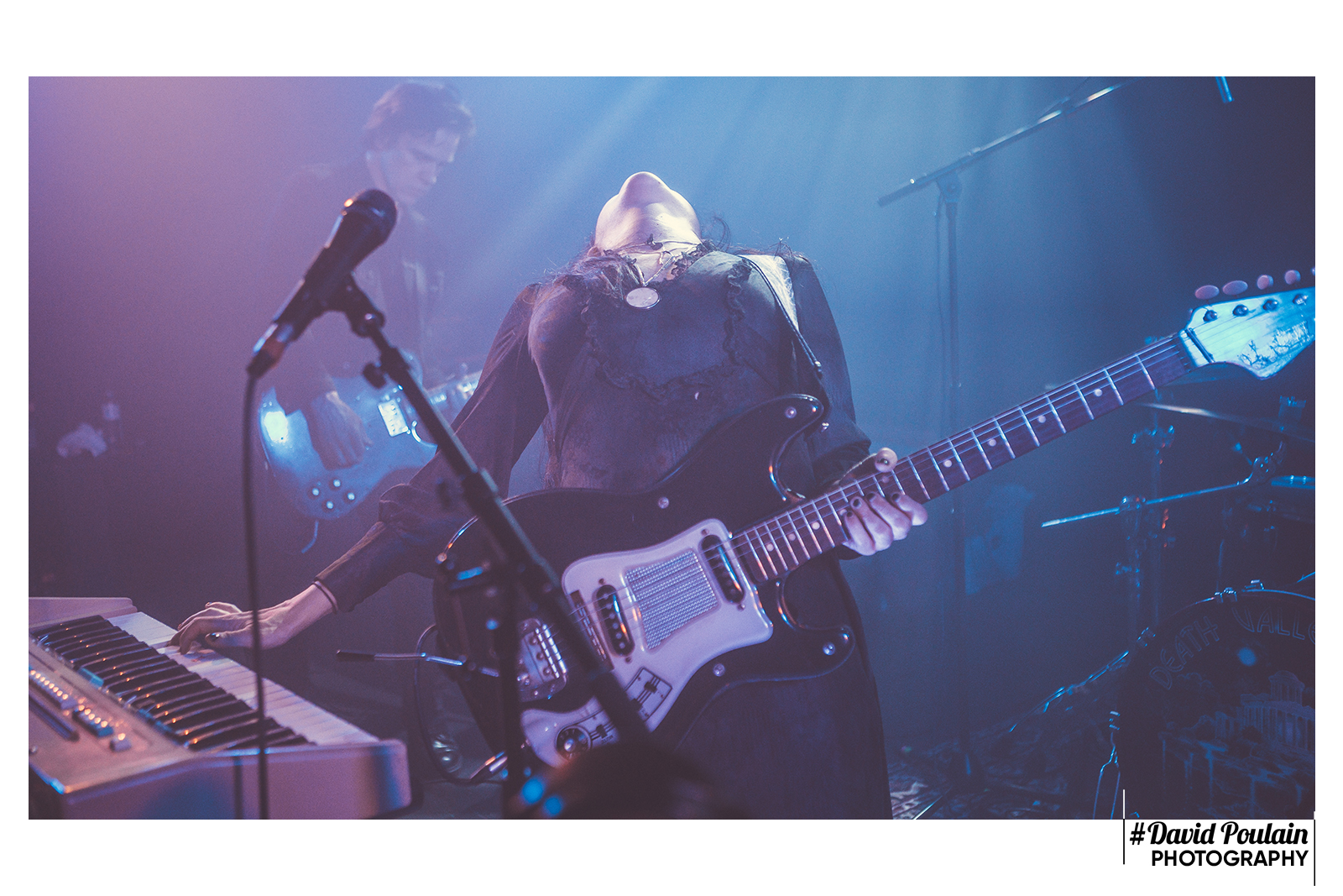 Les Death Valley Girls figurent en tête de gondole de la chaine Youtube de Squeeze Records. Le groupe de Los Angeles, découverts l’an passé au festival Lévitation d’Angers, semble très représentatif de ce label qui met à l’honneur des formations Riot Grrrl. Bien que leur nom peut évoquer Russ Meyer pour les addicts de vieux films de série B, s’il fallait trouver une référence cinématographique à leur musique, on taperait plutôt du côté de Roger Corman. Leurs morceaux flirtent sans vergogne avec une ambiance gentiment dark. Il n’est donc pas étonnant que les trois musiciennes et l’unique musicien s’installent dans un silence plus qu’inhabituel. Une nappe d’électro sépulcrale s’invite discrètement. Nous tournant le dos, la chanteuse Bonnie Bloomgarden et la bassiste remplaçante de la titulaire en titre Samantha Westervelt s’enlacent face à la blonde batteuse Rikki Styxx. Et soudain, Larry Schemel brise ce rituel d’un riff rugueux et des coups sourds de grosse caisse lui répondent. L’intro dure longtemps. Nous avons le temps d’admirer la plastique de Bonnie Bloomgarden. Ses yeux charbons, rehaussés d’une touche de vert, sa chevelure noire corbeau, la lumière bleue fluo qui l’éclaire du sol… Elle aussi assure dans sa tenue de scène !