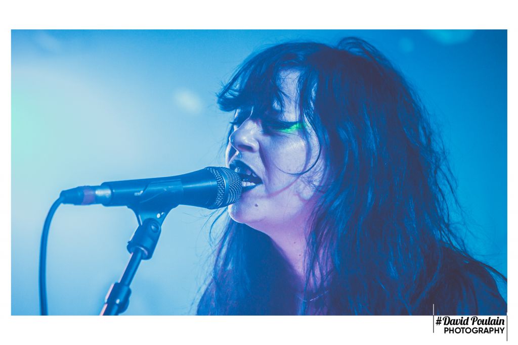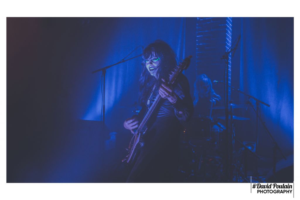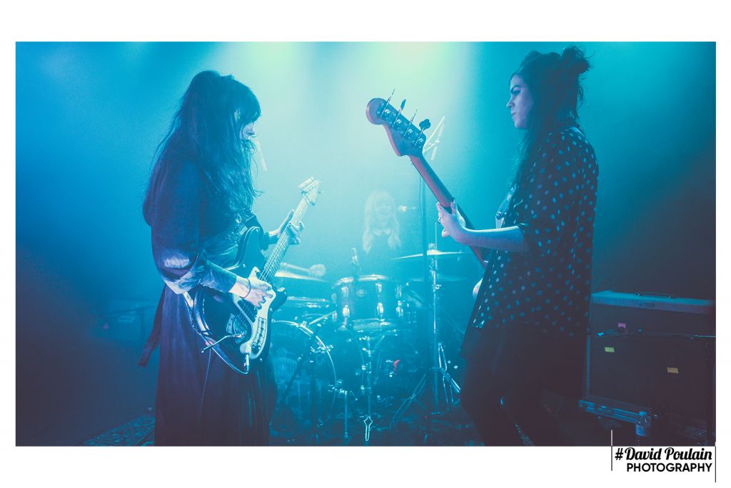 Les Death Valley Girls figurent en tête de gondole de la chaine Youtube de Squeeze Records. Le groupe de Los Angeles, découverts l’an passé au festival Lévitation d’Angers, semble très représentatif de ce label qui met à l’honneur des formations Riot Grrrl. Bien que leur nom peut évoquer Russ Meyer pour les addicts de vieux films de série B, s’il fallait trouver une référence cinématographique à leur musique, on taperait plutôt du côté de Roger Corman. Leurs morceaux flirtent sans vergogne avec une ambiance gentiment dark. Il n’est donc pas étonnant que les trois musiciennes et l’unique musicien s’installent dans un silence plus qu’inhabituel. Une nappe d’électro sépulcrale s’invite discrètement. Nous tournant le dos, la chanteuse Bonnie Bloomgarden et la bassiste remplaçante de la titulaire en titre Samantha Westervelt s’enlacent face à la blonde batteuse Rikki Styxx. Et soudain, Larry Schemel brise ce rituel d’un riff rugueux et des coups sourds de grosse caisse lui répondent. L’intro dure longtemps. Nous avons le temps d’admirer la plastique de Bonnie Bloomgarden. Ses yeux charbons, rehaussés d’une touche de vert, sa chevelure noire corbeau, la lumière bleue fluo qui l’éclaire du sol… Elle aussi assure dans sa tenue de scène !