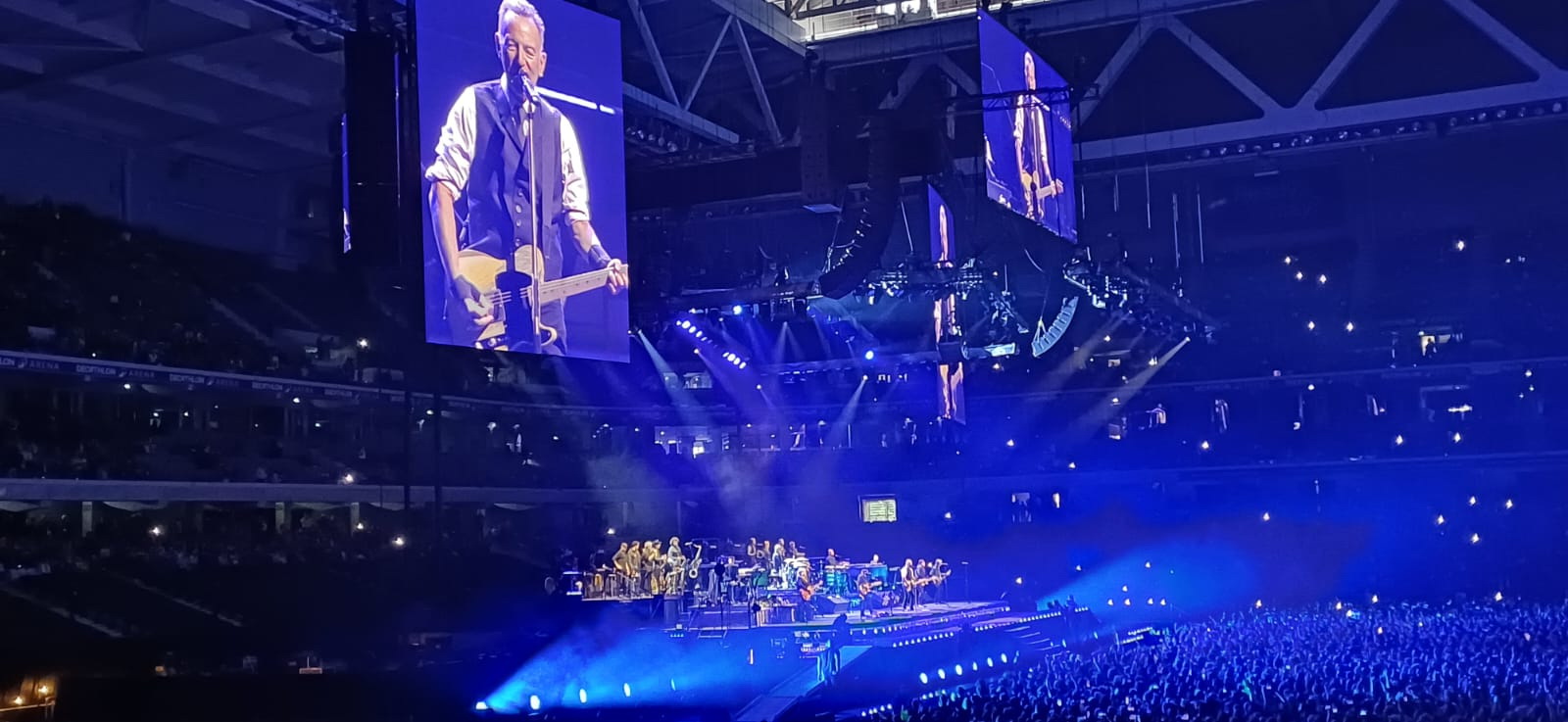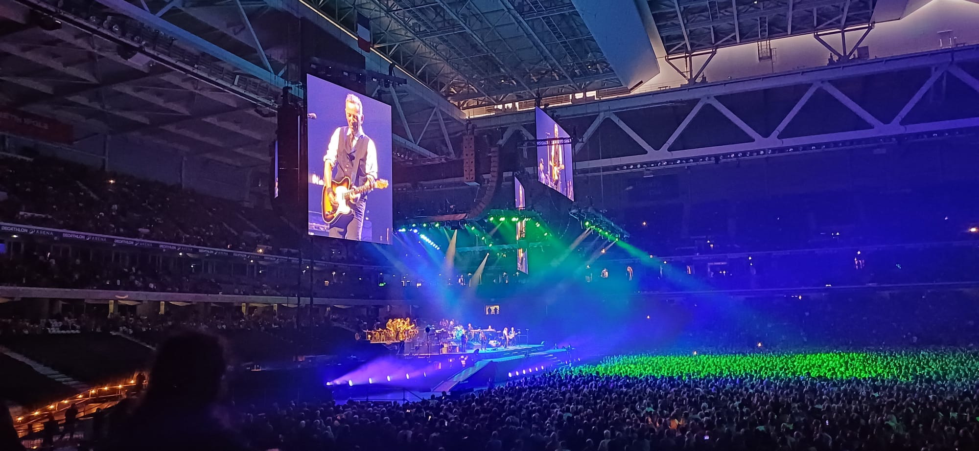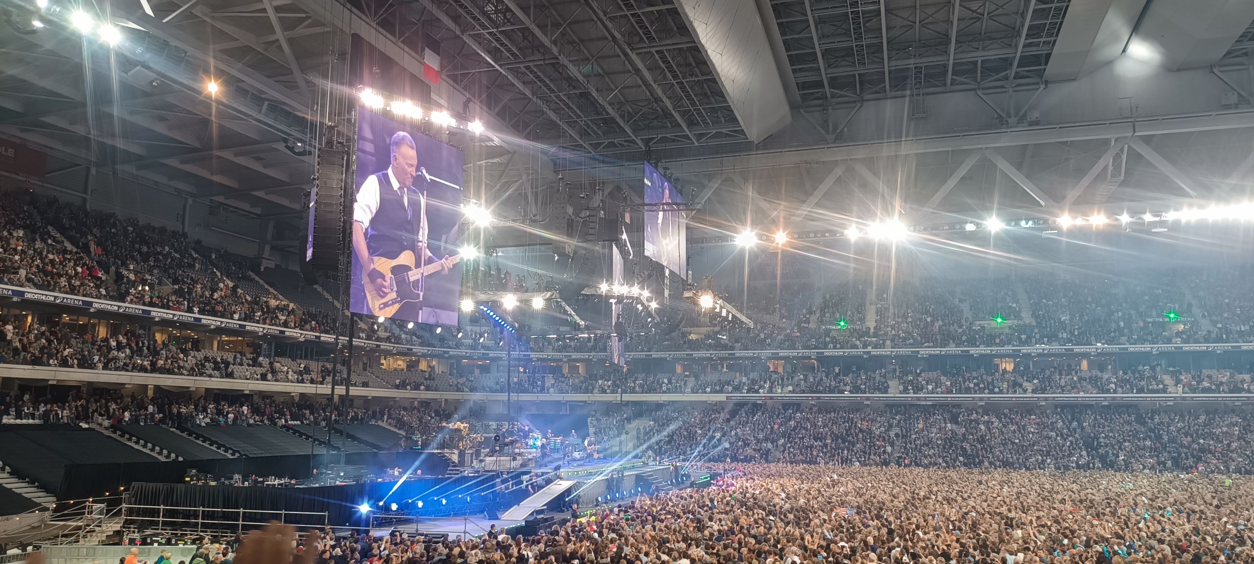 D Day ! Les t-shirts des différentes tournées du Boss fleurissent dans le centre-ville Lillois et, dès la fin d’après-midi, direction le métro pour s’approcher du magnifique écrin qu’est le stade Pierre Mauroy. 18h c’est la tuile ! Le métro s’interrompt et malgré quelques nouvelles rassurantes, il ne redémarrera pas de la soirée. Nous faisons partie des chanceux à pouvoir rallier l’enceinte du show en voiture, sans PV et à l’heure ! Nous ne raterons pas le début du show, malheureusement tout le monde ne pourra pas en dire autant.