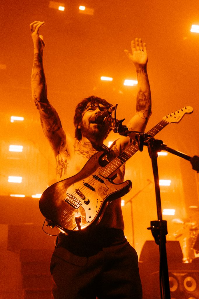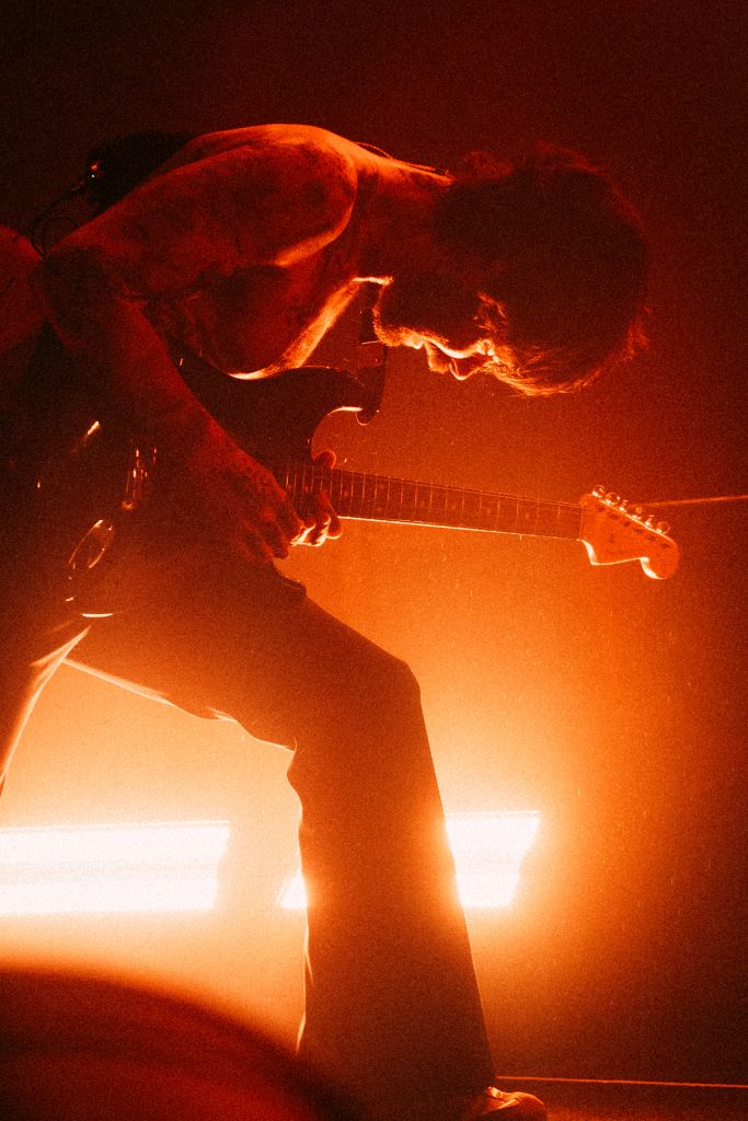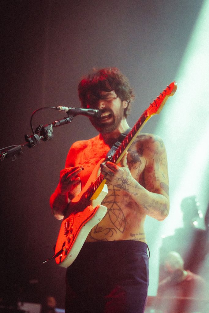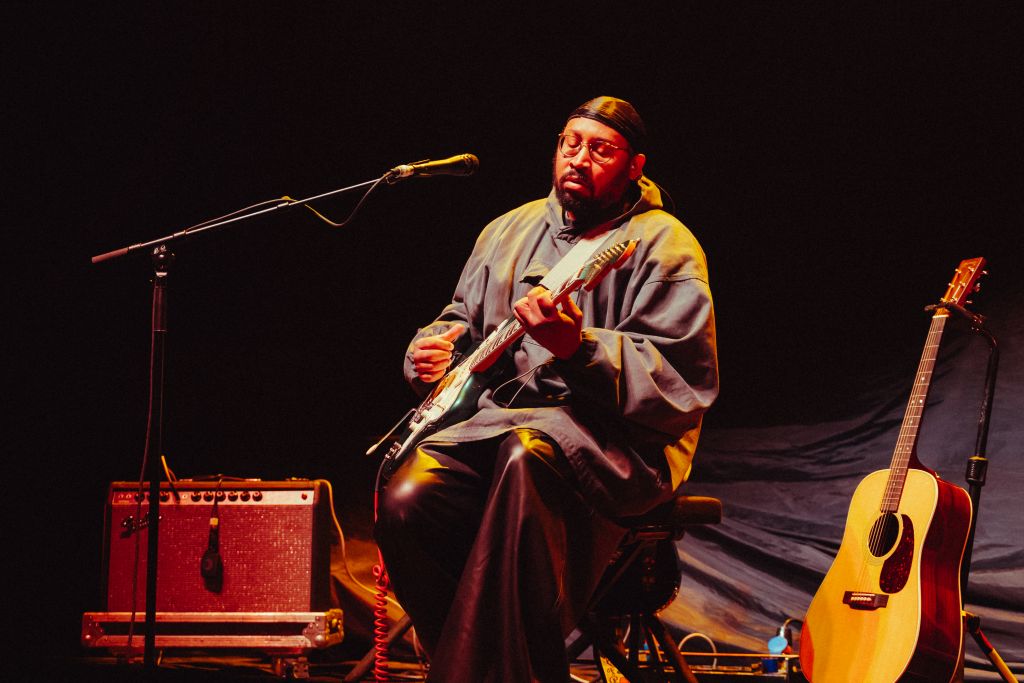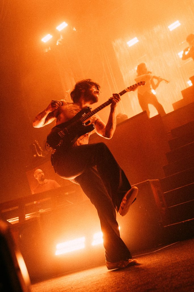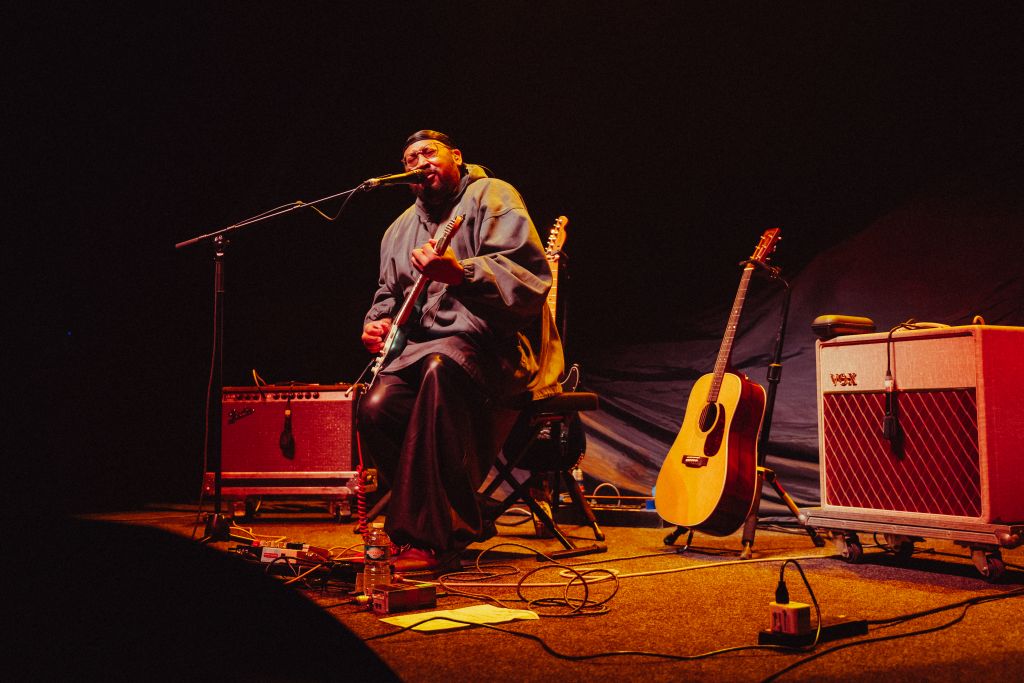 La salle est déjà conséquemment remplie pour le set de Bartees Strange. Le musicien états-unien né en Angleterre se produit seul, armé seulement d'une guitare acoustique puis d'une guitare électrique. Côté mise en scène, difficile de faire plus sobre : le bonhomme est assis sur un tabouret, quatre projecteurs orange l’illuminent d'une douce clarté d'aurore, tandis que le grand rideau qui cache l'installation de Biffy Clyro s'agite doucement.
