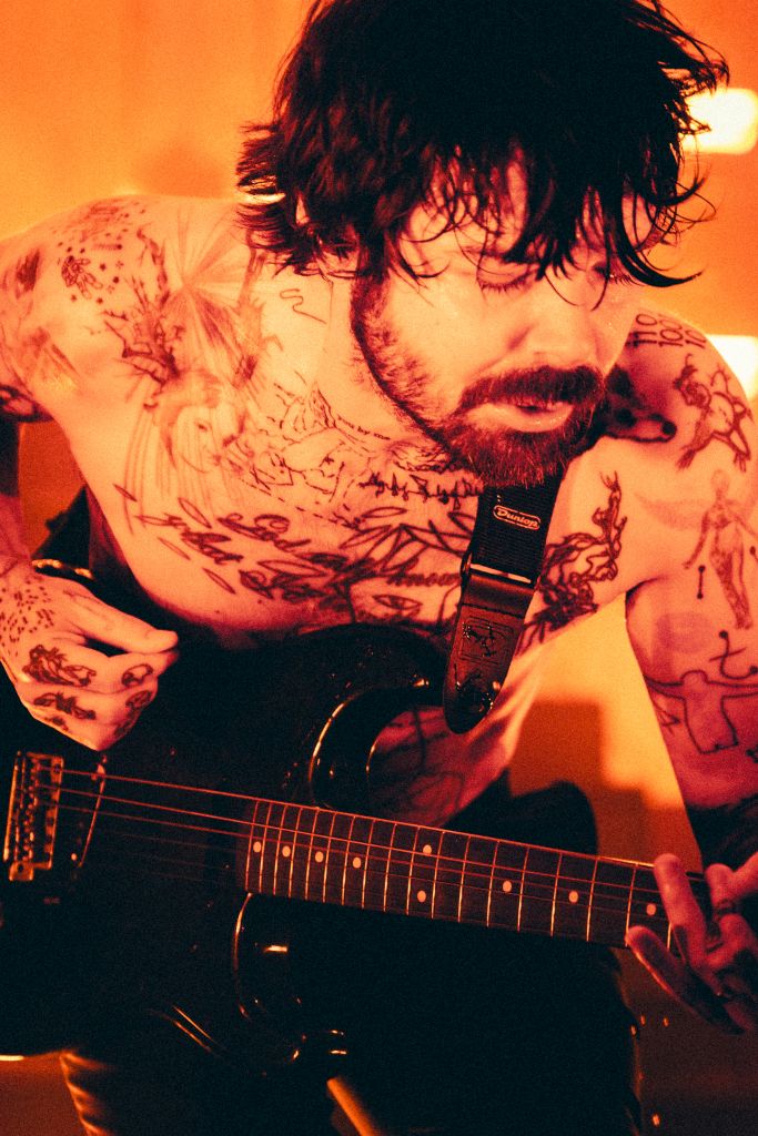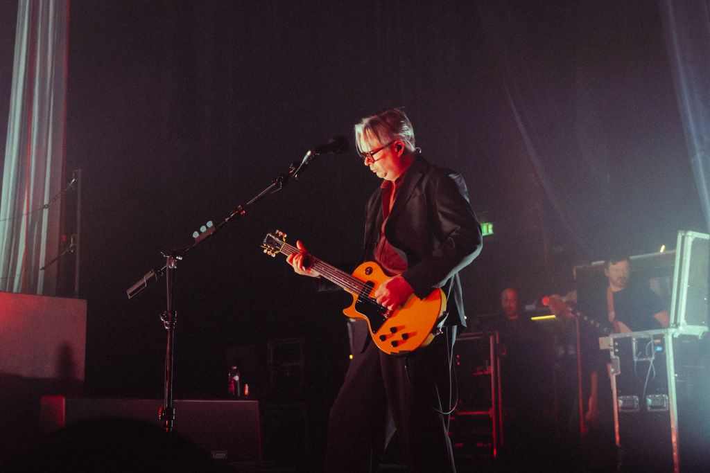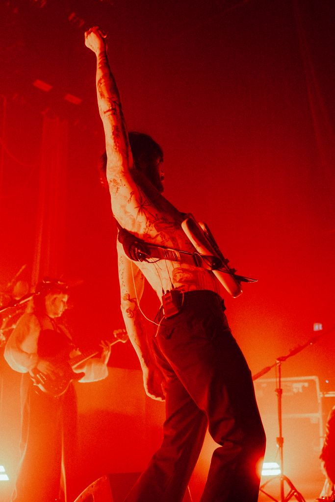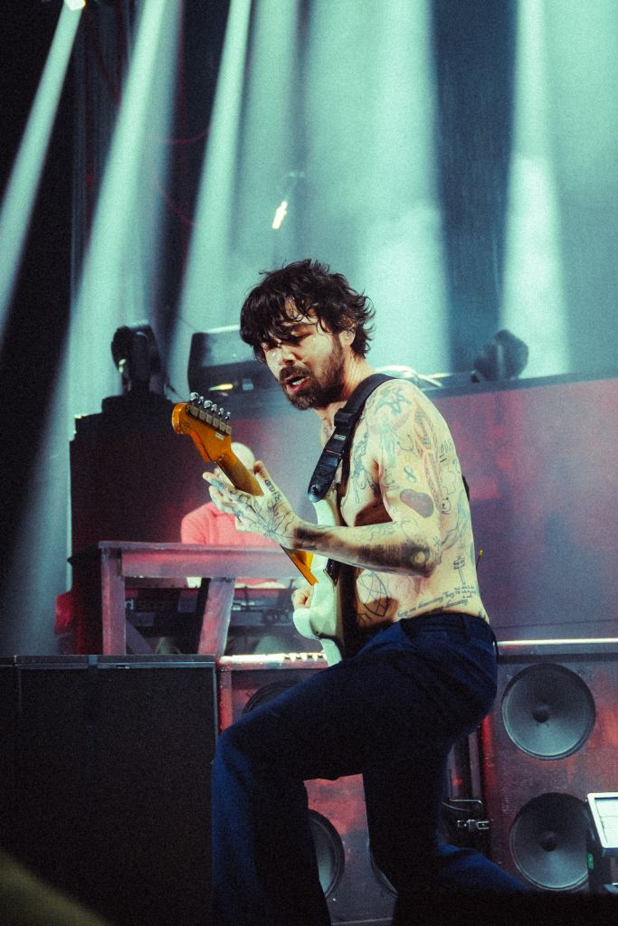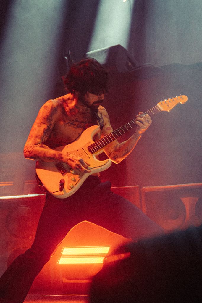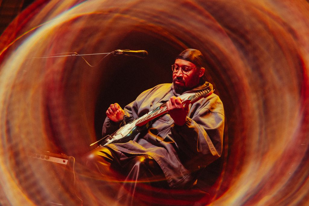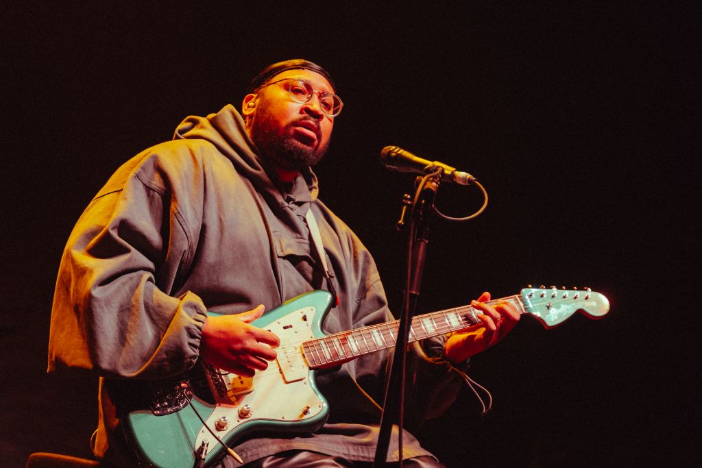 La salle est déjà conséquemment remplie pour le set de Bartees Strange. Le musicien états-unien né en Angleterre se produit seul, armé seulement d'une guitare acoustique puis d'une guitare électrique. Côté mise en scène, difficile de faire plus sobre : le bonhomme est assis sur un tabouret, quatre projecteurs orange l’illuminent d'une douce clarté d'aurore, tandis que le grand rideau qui cache l'installation de Biffy Clyro s'agite doucement.
