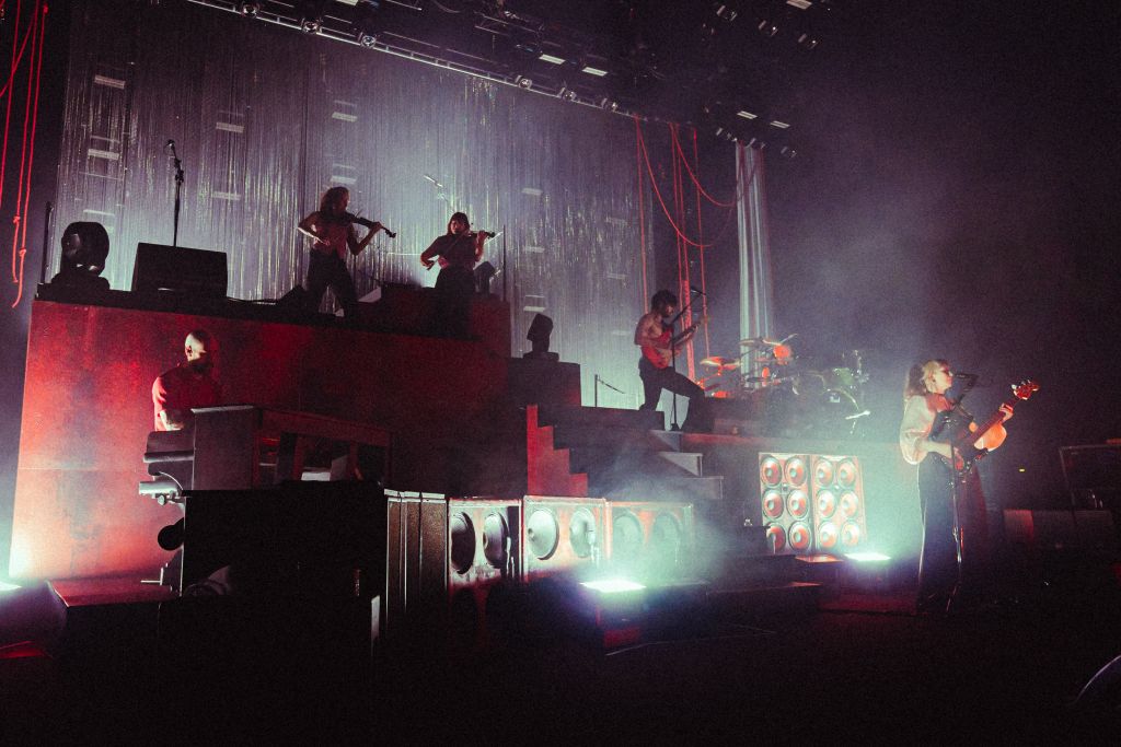 Mais entre sa mise en scène et sa formation à sept, le groupe perd en rage brute ce qu’il gagne en ampleur et en sens du spectacle. Le vocaliste et les violonistes se succèdent sur les escaliers et les différents niveaux de plateforme, venant aussi rendre visite au batteur, ce qui apporte du dynamisme. L’apport des cordes, présentes sur la majorité des chansons, est plaisant, plus ou moins perceptible selon les titres, permettant sur certains de reproduire en live les cordes saccadées qui parsèment la discographie du groupe – le meilleur exemple étant probablement « Living Is a Problem because Everything Dies », apportant ailleurs une atmosphère un peu différente. L’apport du clavier est plus discret mais participe aussi à créer des ambiances parfois intrigantes, parfois distordues. Le son presque d’orgue en introduction du magnifique « Different People » est saisissant. Et aux chœurs habituels de Ben Johnston, s’ajoutent ceux de la bassiste, qui, quand ils parviennent à se distinguer des autres, apportent encore un élément supplémentaire.