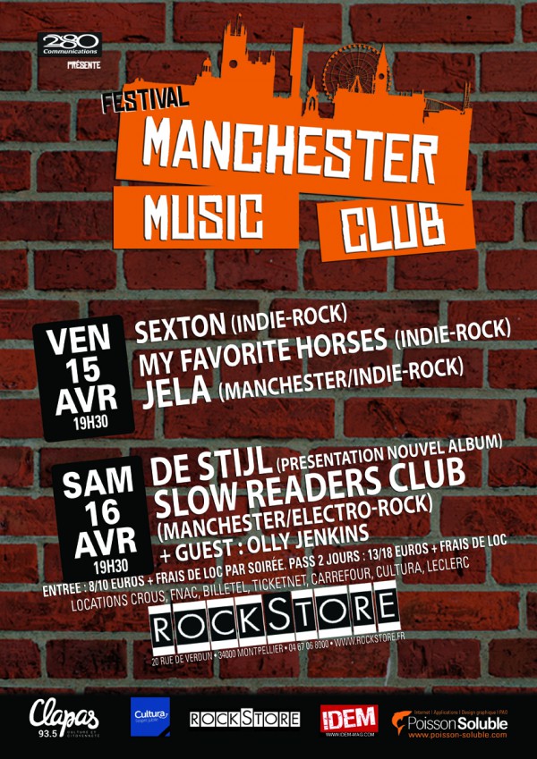On découvrira donc venant de Manchester le Slow Readers Club, Jela des Français installés à Manchester depuis 5 ans, mais aussi Olly Jenkins, un duo de Manchester installé à Montpellier. Et côté français, Sexton, et les Montpelliérains de My Favorite Horses et de DeStijl qui nous présenteront leur nouvel album.