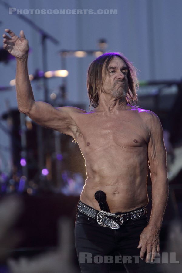Cette fois, pas de place pour le hasard, il fallait être là tôt pour avoir la chance d'être à moins de 10 mètres de la scène. L'air s'est rafraîchi, mais pas l'ambiance, survoltée. Il est presque 20 heures, et voilà que s'avance Iggy, torse nu et jean (qu'il ne descendra pas... signe des temps...), pour un "I wanna be your dog" de la première heure. A la guitare, point de Josh Homme: le guitariste des Eagles of Death Metal, déprogrammés en raison de propos de Jesse Hughes, accompagnait pourtant le groupe sur plusieurs dates de la tounée...